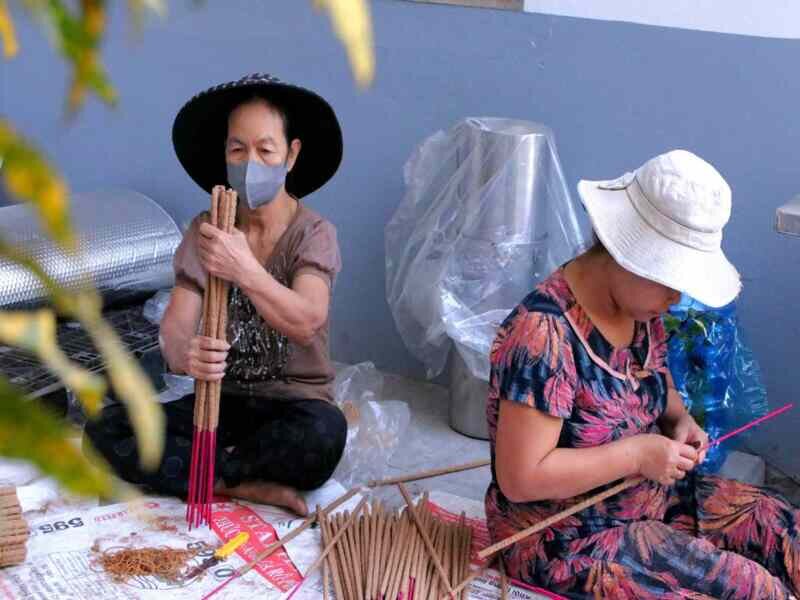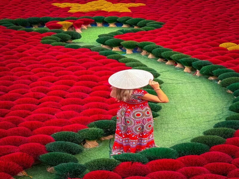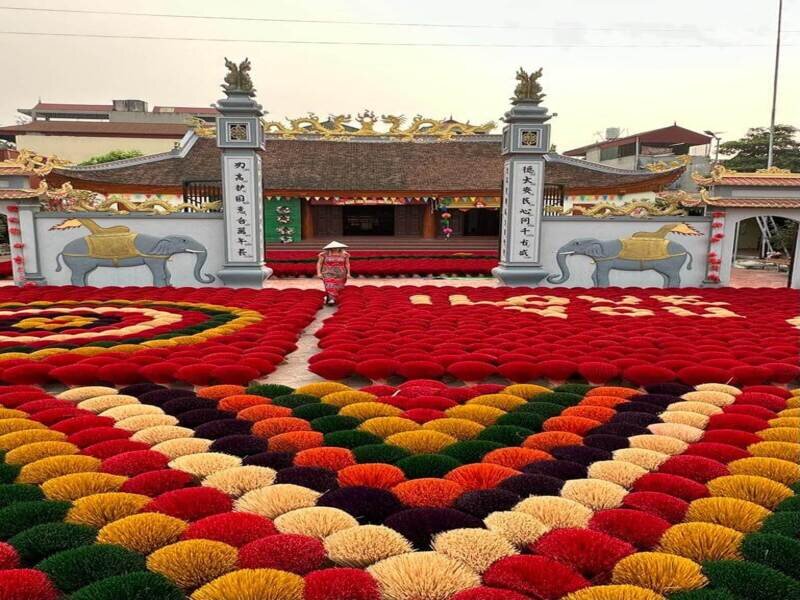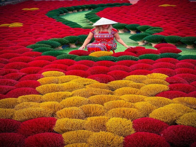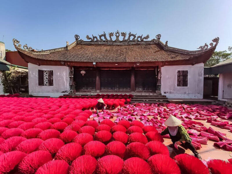 The journey begins at Quang Phu Cau Incense Village, one of Vietnam’s most colorful and photogenic craft villages. Visitors can admire thousands of vibrant pink and red incense bundles while learning about traditional incense-making techniques passed down through generations.